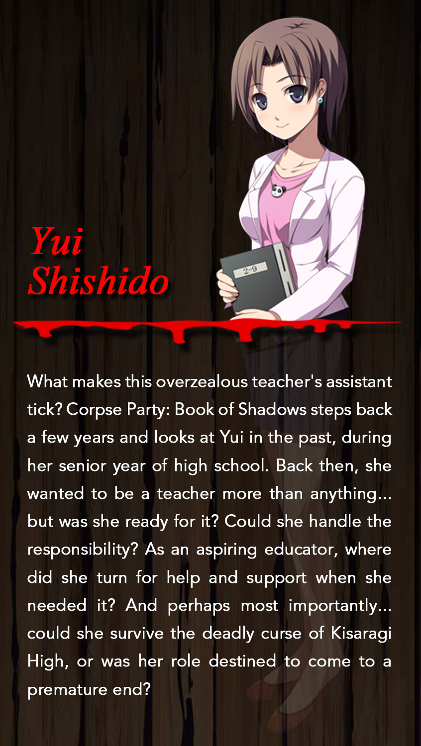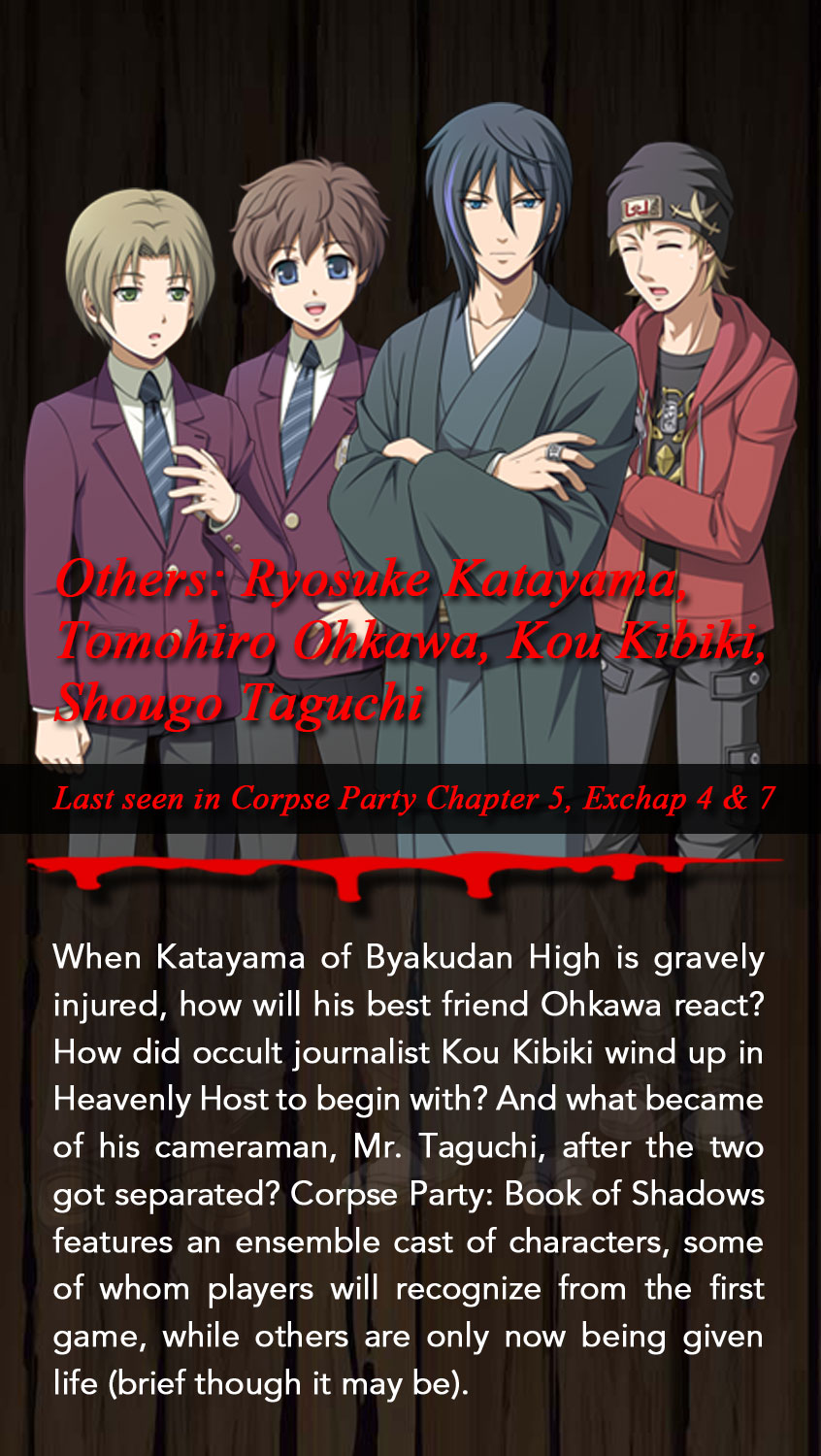 Corpse Party: Book of Shadows is a compilation of eight short stories set before, during and after these events, "fleshing" out the experience and further developing its characters and mythos alike.