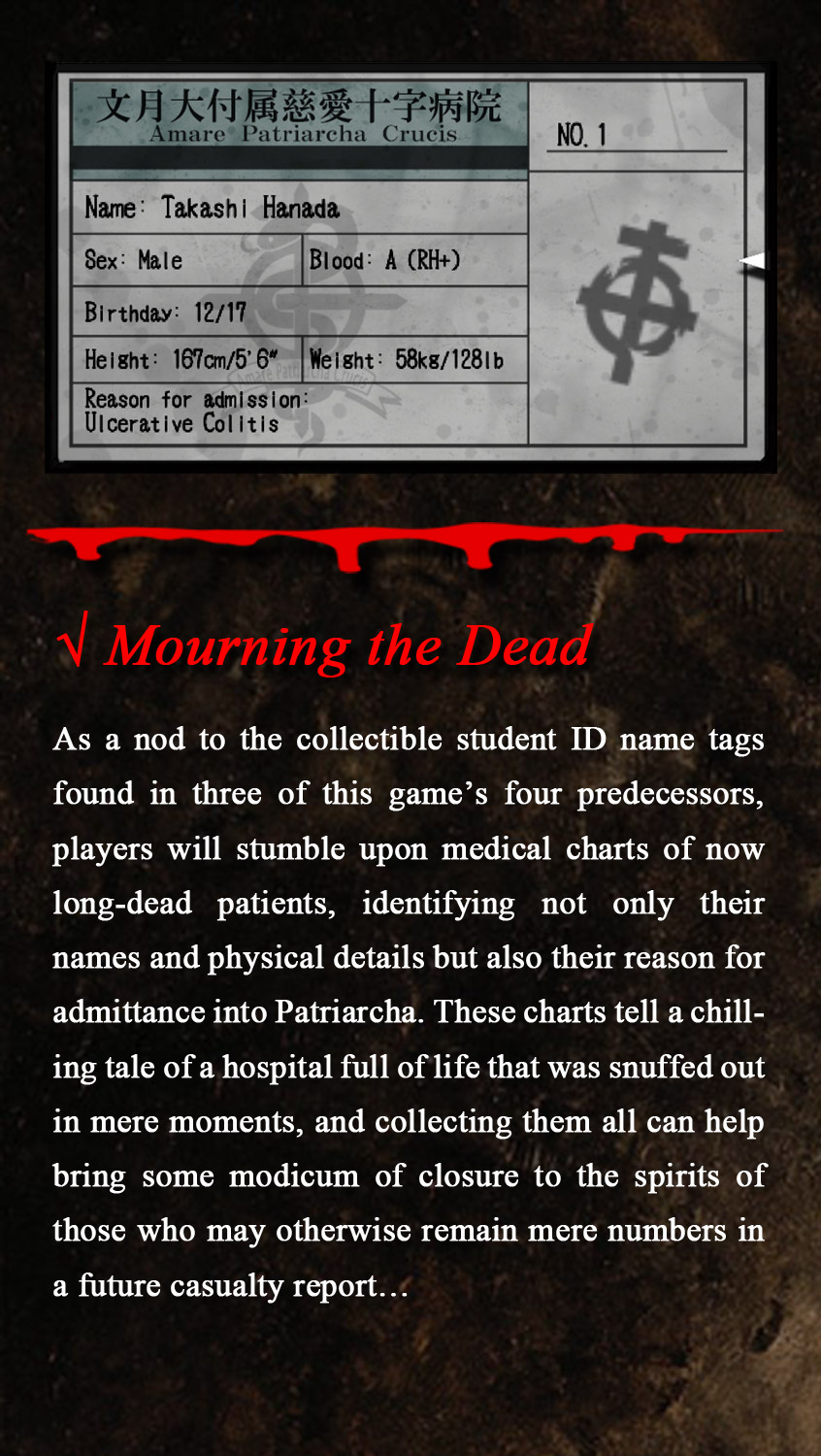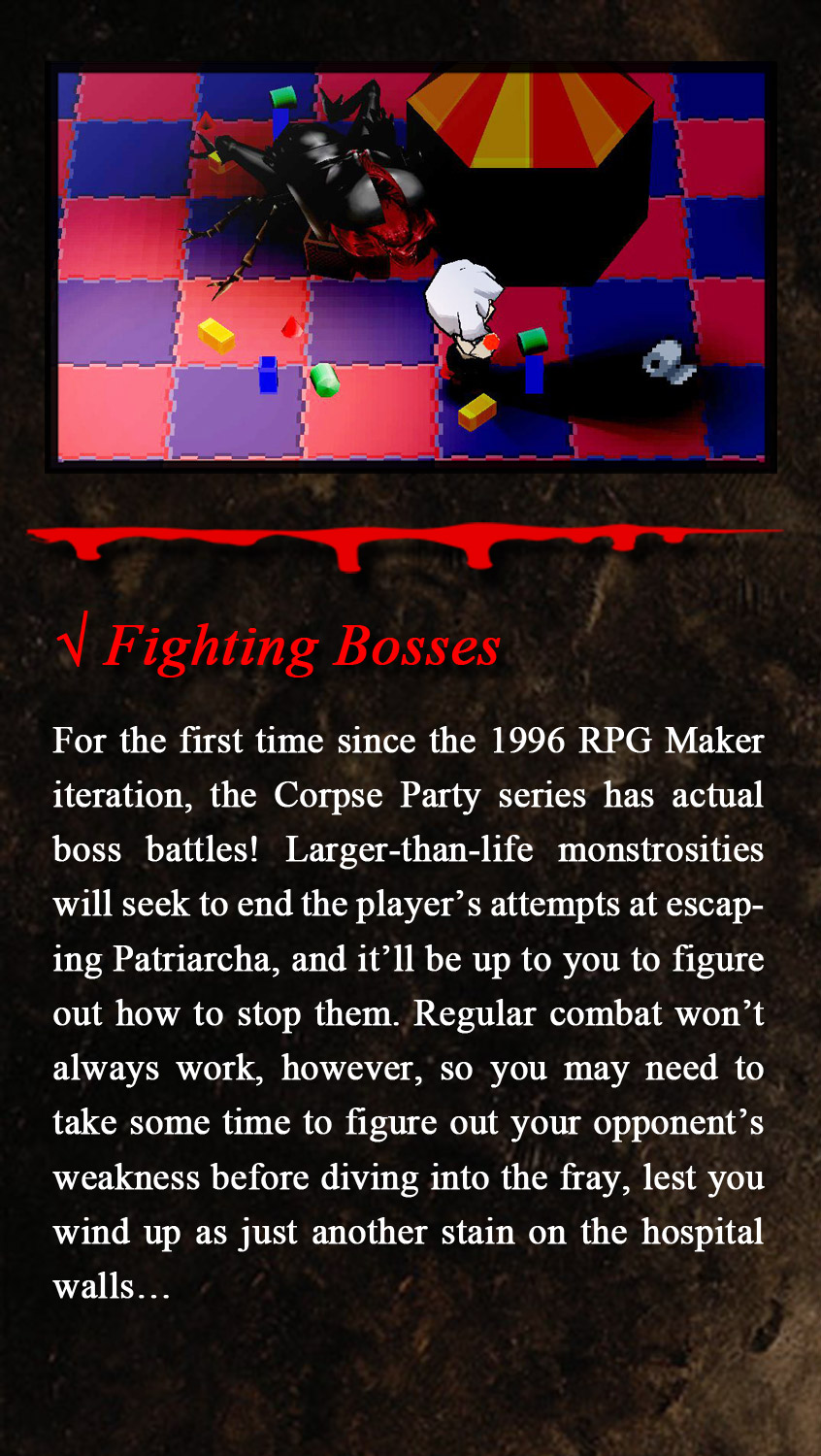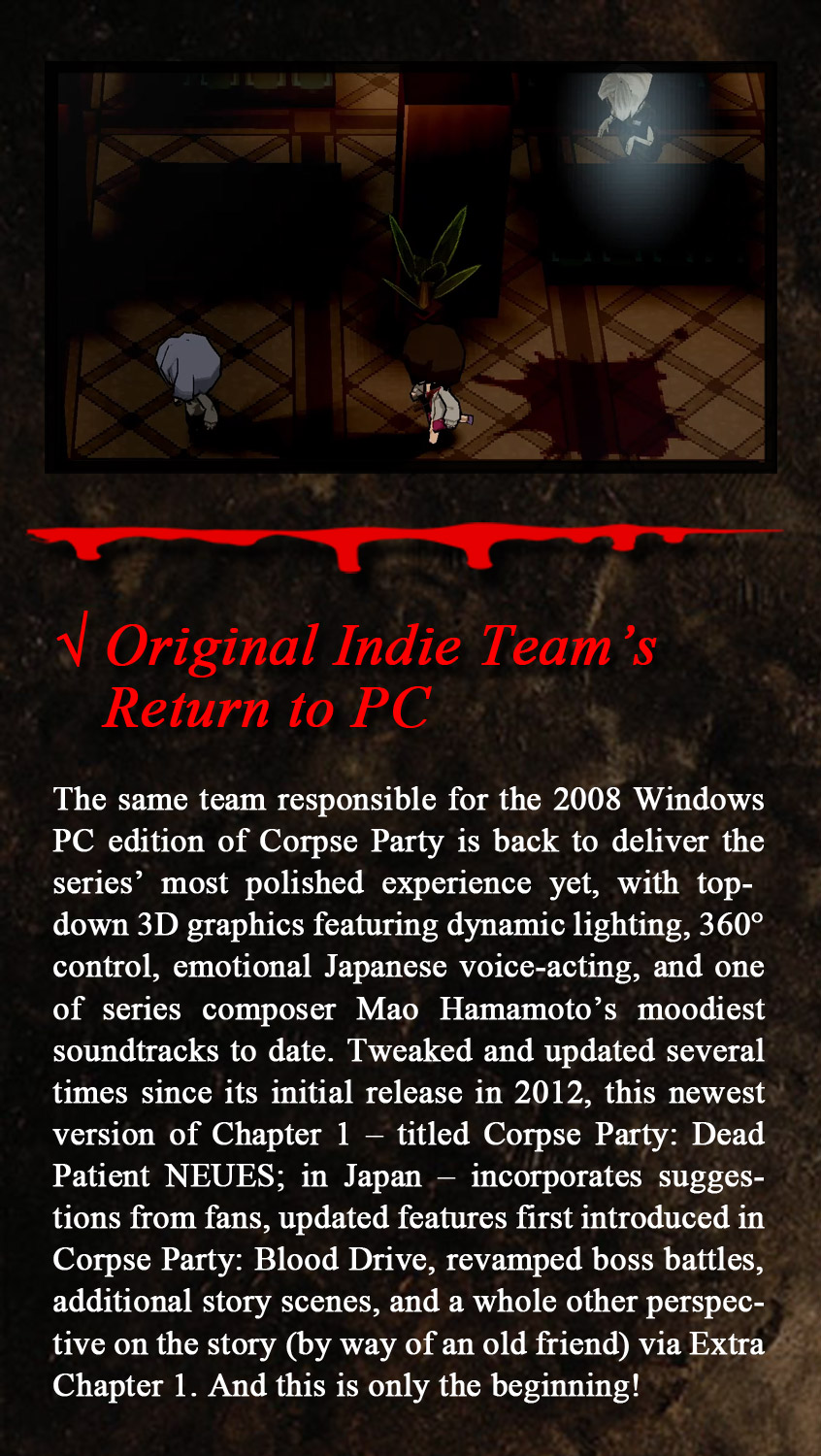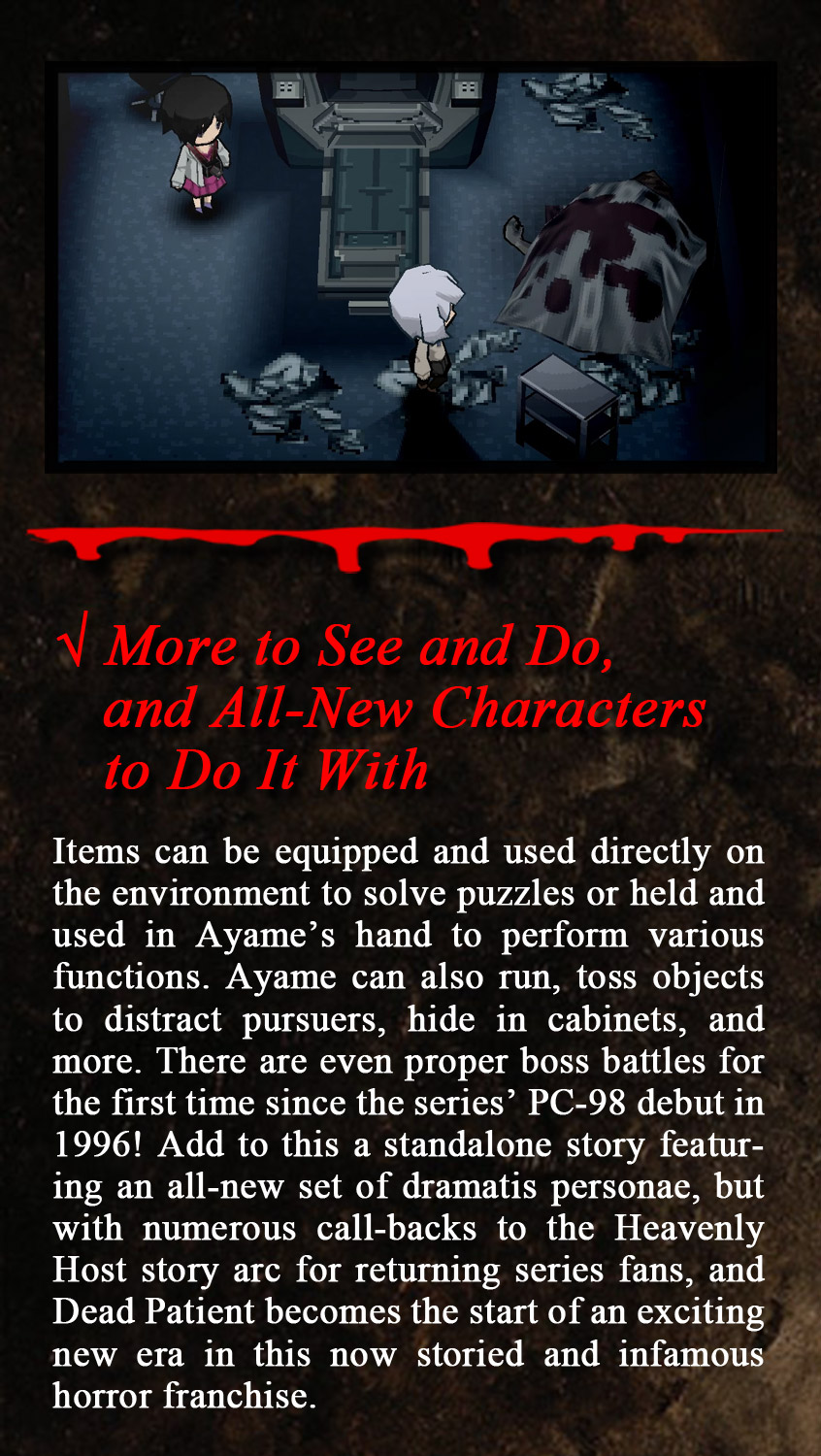 Set five years after the events of Corpse Party: Blood Drive, Dead Patient represents the start of a brand-new storyline for the Corpse Party series – standalone, yet still building upon what's come before. Do you have what it takes to survive your treatment in Patriarcha?