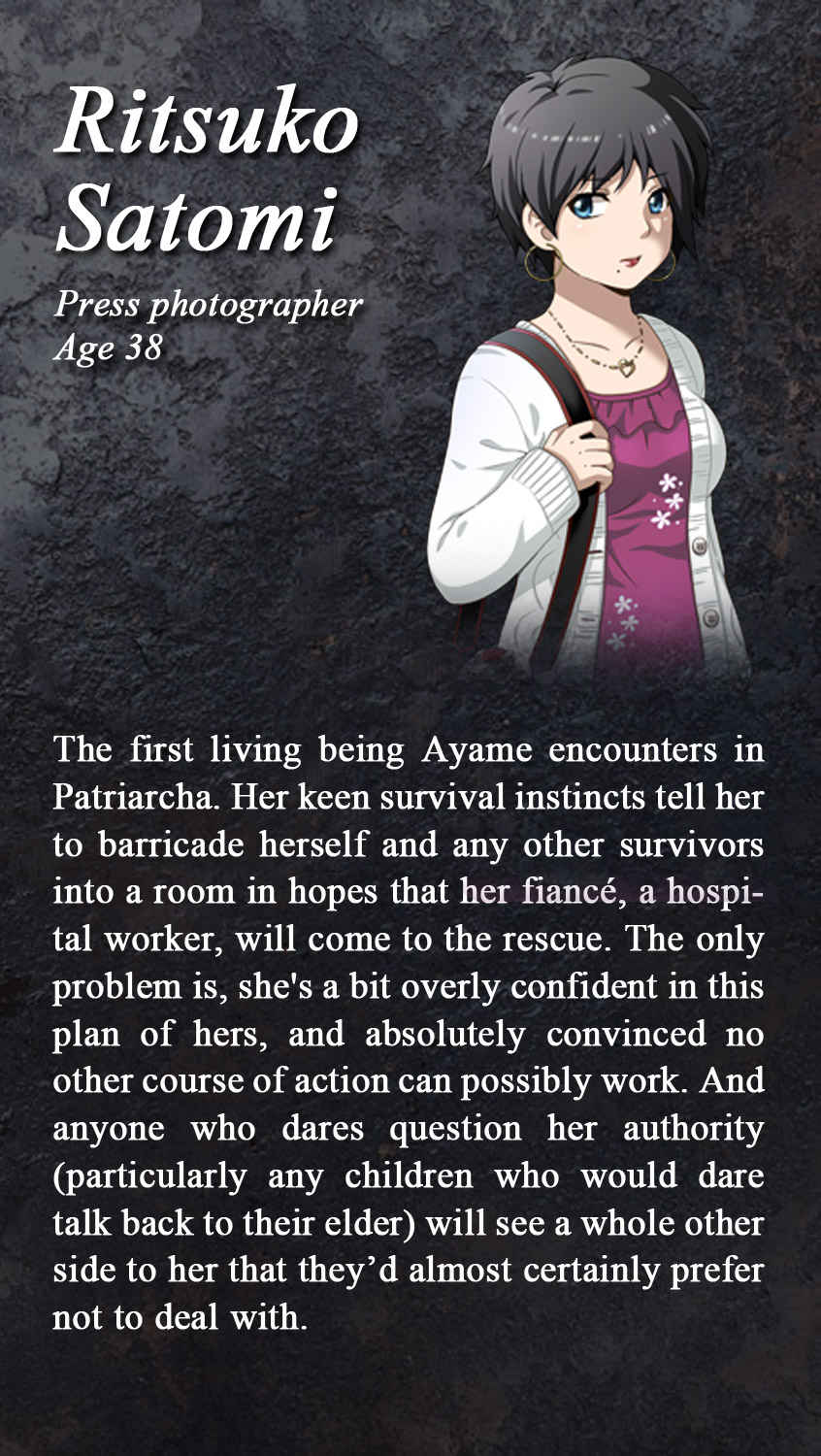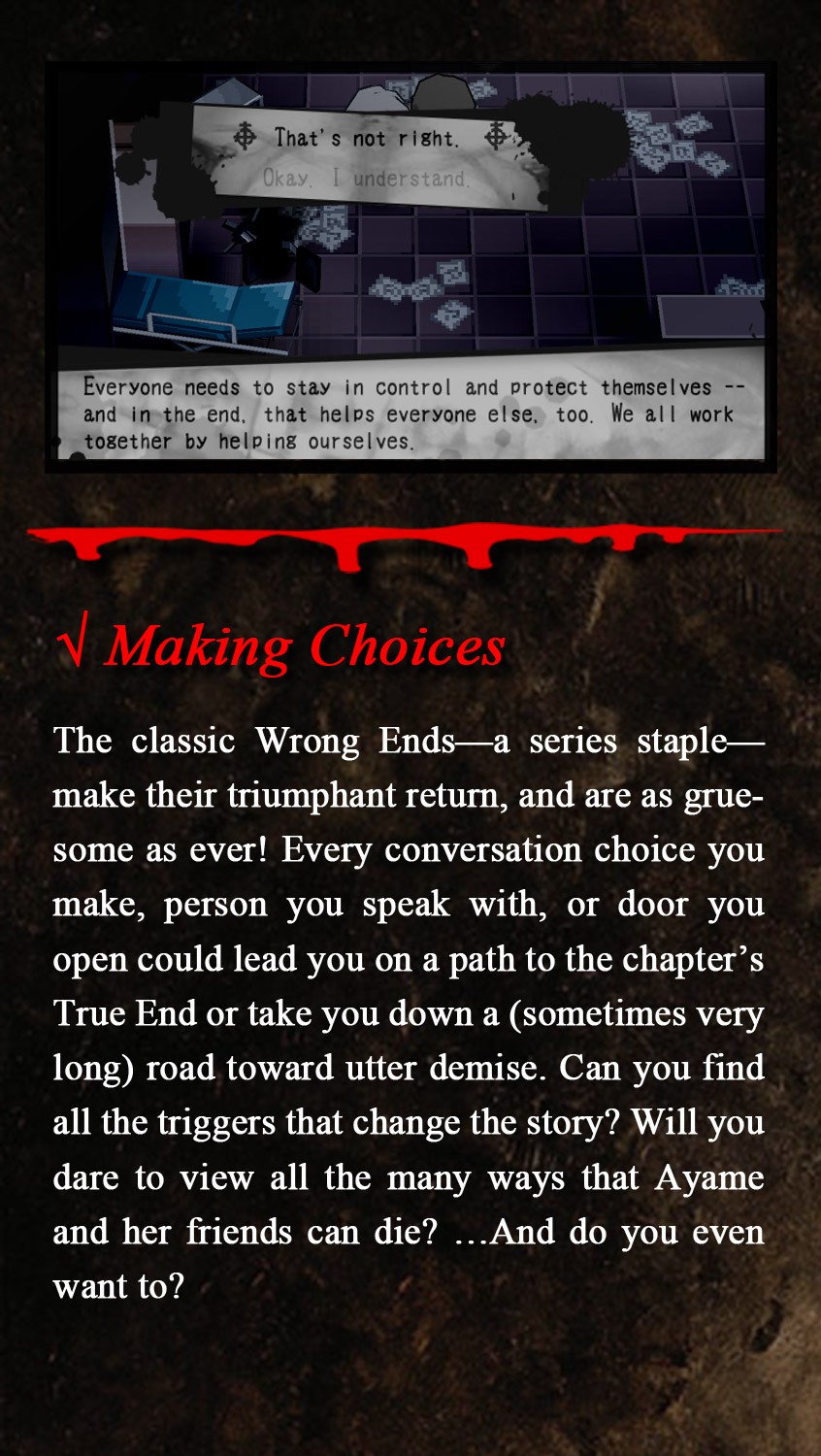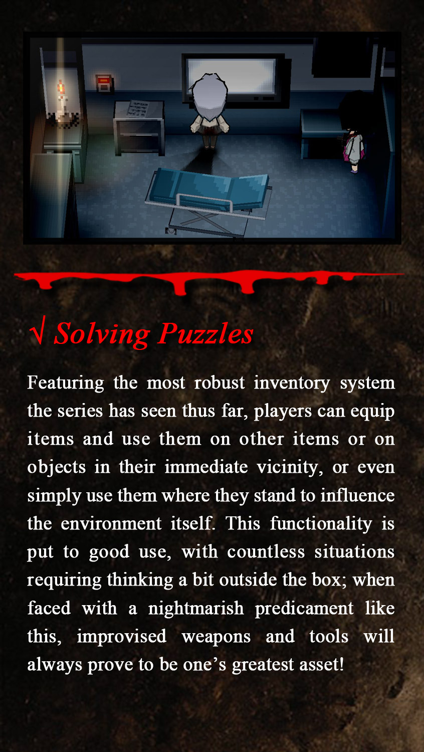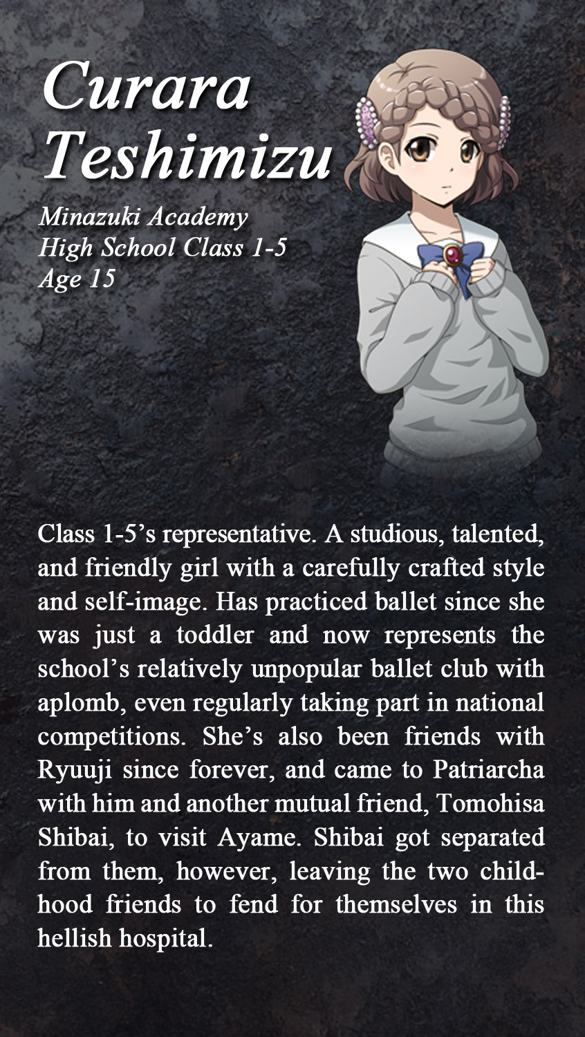 Indeed, there are others in this hospital. Some are friends, trapped here just as Ayame has been. Others are foes: the ones who trapped her here, and who now appear to mean her physical harm. And still others are savage, inhuman monstrosities that shouldn't even exist in this world.